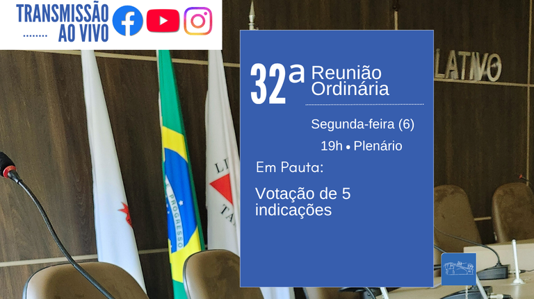 A reunião será realizada no Plenário da Câmara Municipal, aberta ao público, e também transmitida ao vivo nos canais oficiais do Legislativo no Facebook, YouTube e Instagram.