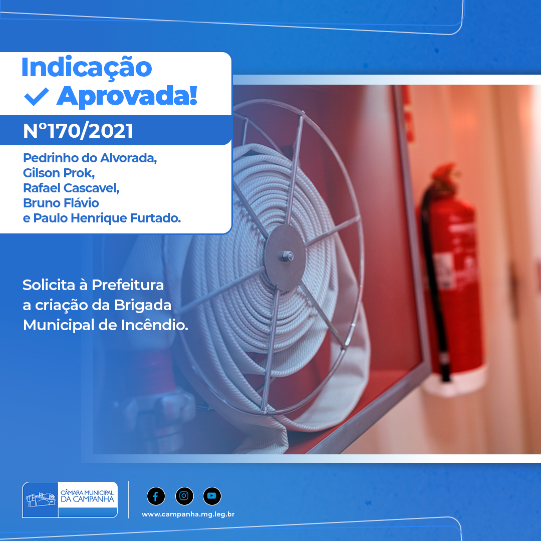 De autoria dos Vereadores Pedro Messias Alves (Patriota), Bruno Flávio da Silva (PSB), Gilson Cezar Prok (Patriota), Edwirges Rafael dos Reis (PSB) e Paulo Henrique Furtado (PSDB), solicita à Prefeitura a criação da Brigada Municipal de Incêndio.