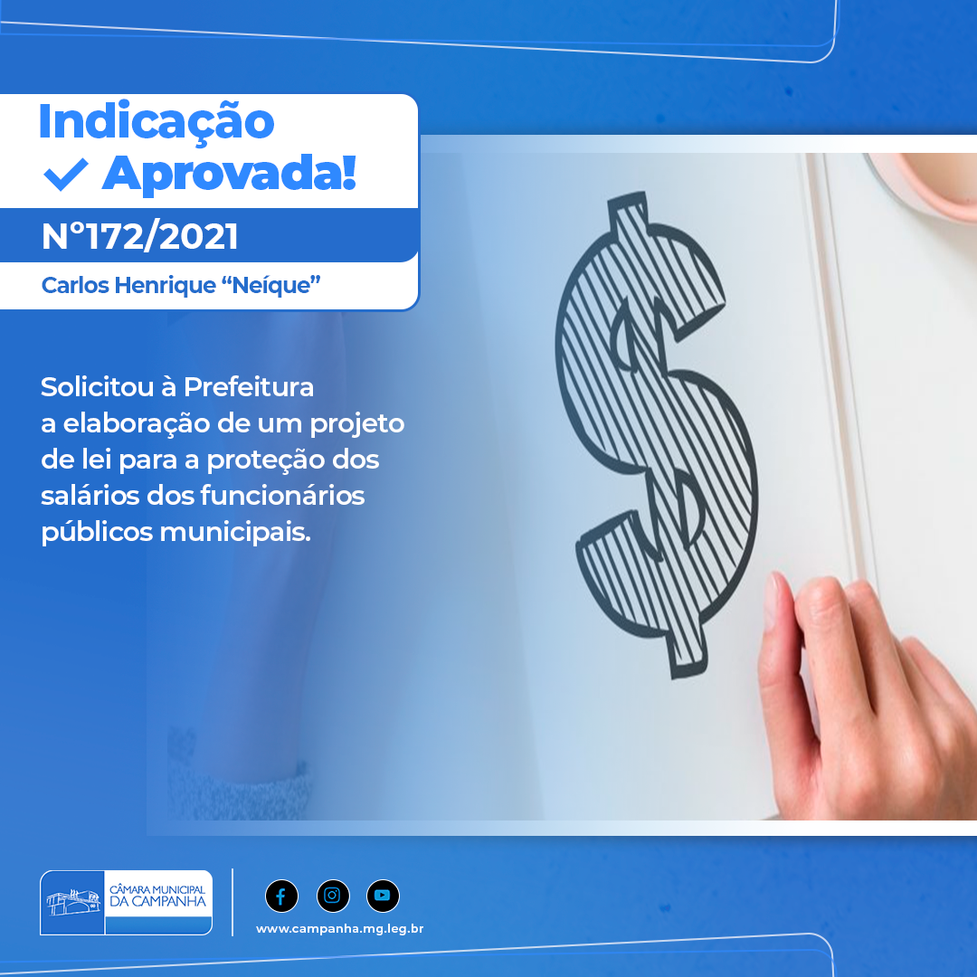 De autoria do Vereador Carlos Henrique “Neíque” (PSD), solicita à Prefeitura a elaboração e envio para análise desta Casa de um projeto de lei de proteção aos salários dos funcionários públicos municipais, onde se estabeleça de forma antecipada um índice indexador dos mesmos a ser usado como índice mínimo por ocasião da revisão geral prevista no inciso X do artigo 37 da Constituição Federal. Podendo incluir neste mesmo projeto de lei um possível mecanismo de recuperação de perdas salariais dos últimos sete anos.